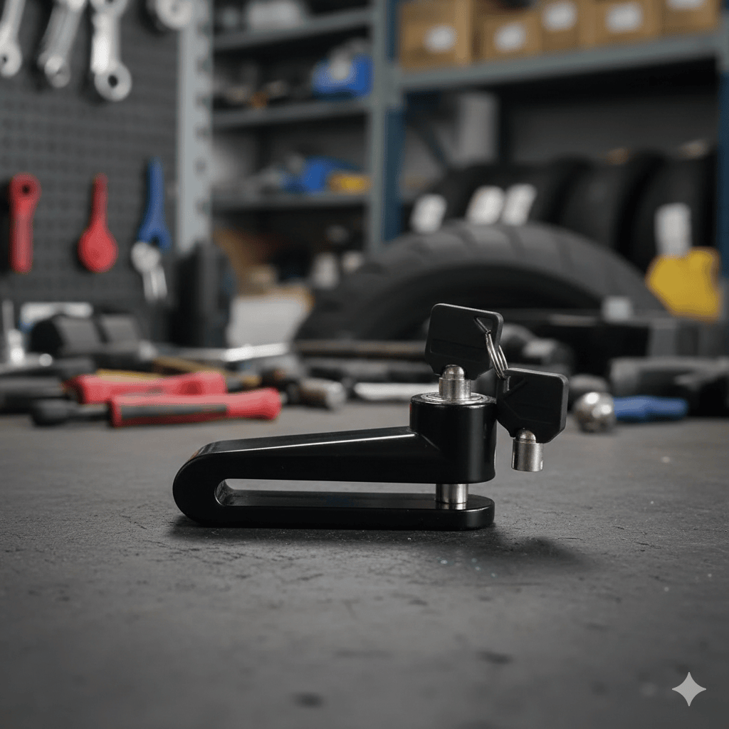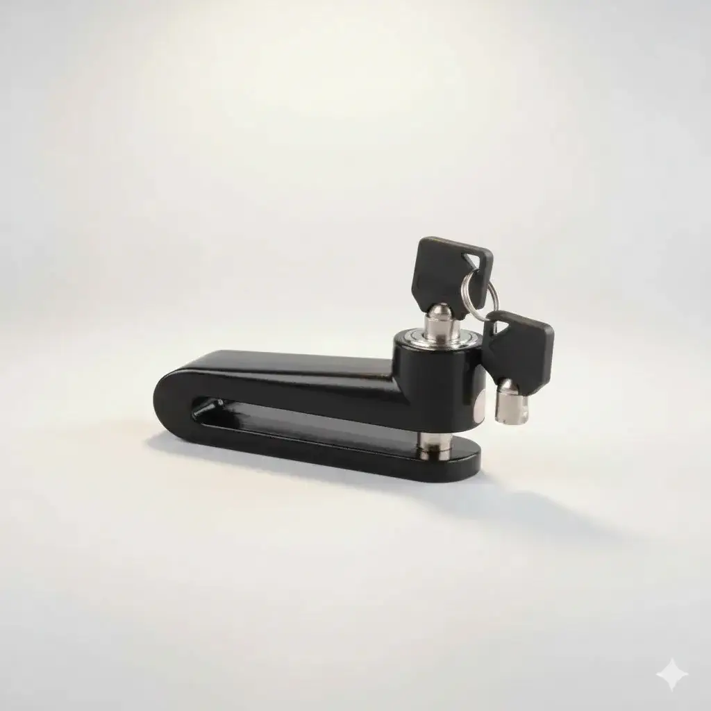 Es un bloqueo mecánico para frenos de disco. También inmoviliza la rueda mediante un pasador endurecido. Así, impide el giro y reduce intentos rápidos de hurto.