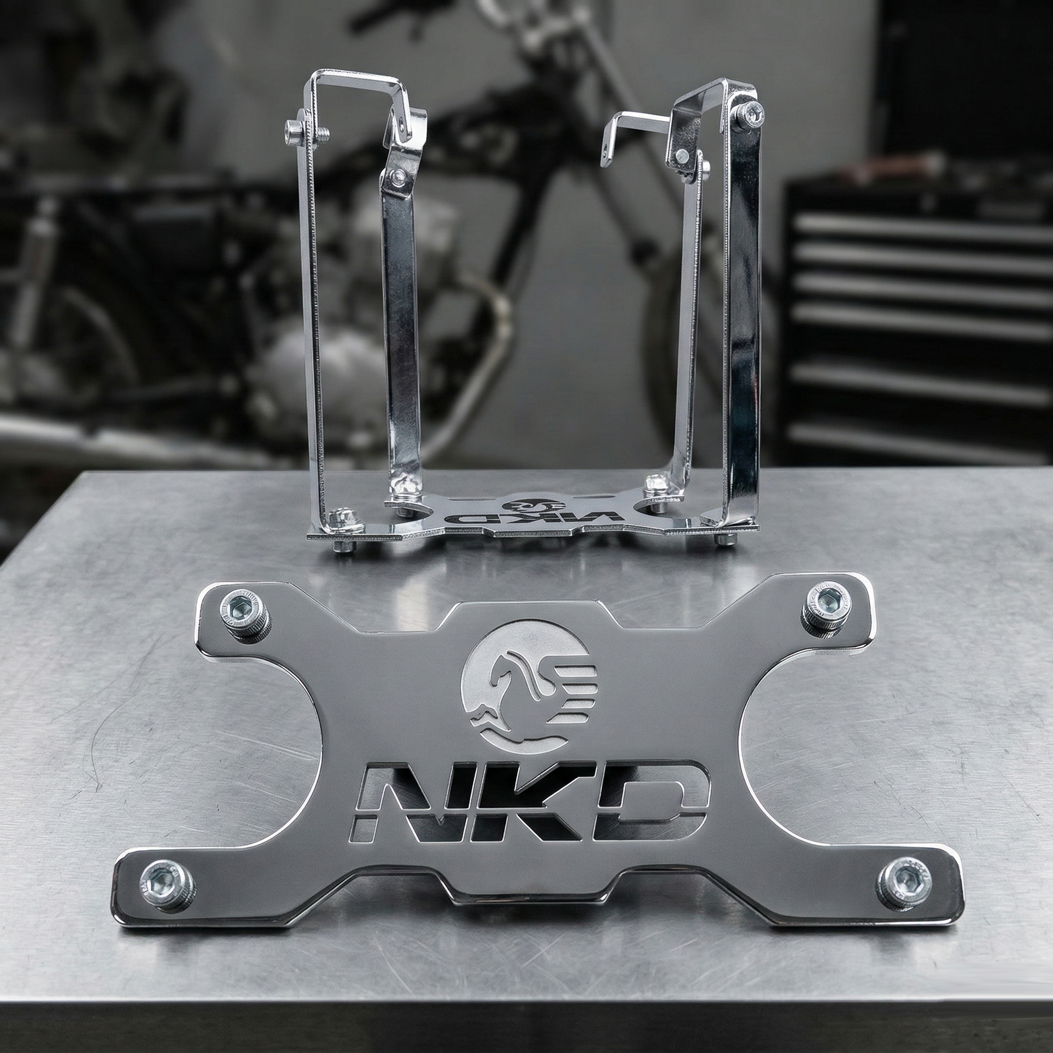 Estructura metálica robusta con cortes de precisión. Presenta acabado cromado resistente a la intemperie. Incluye perforaciones y sujeciones para montaje directo. El diseño permite limpiar y revisar sin desmontar. Asimismo, su forma respeta el recorrido de suspensión.
