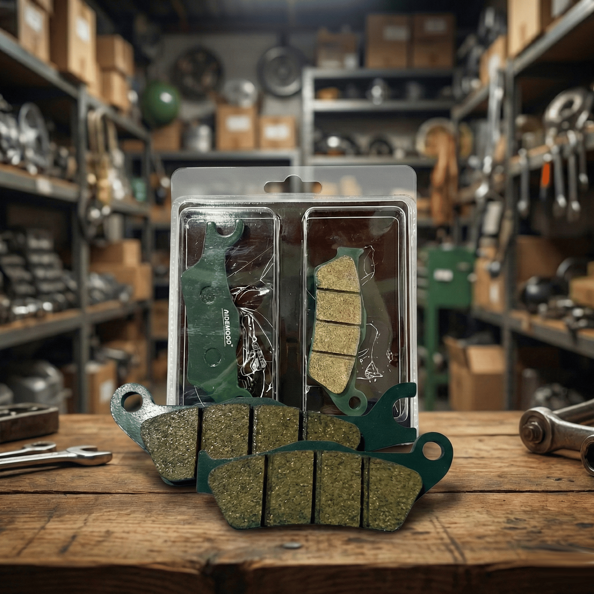 Pastillas Ridemood con compuesto cerámico. Frenado progresivo, bajo polvo y menor desgaste del disco. Ajuste directo para Splendor e Invicta CBF150.