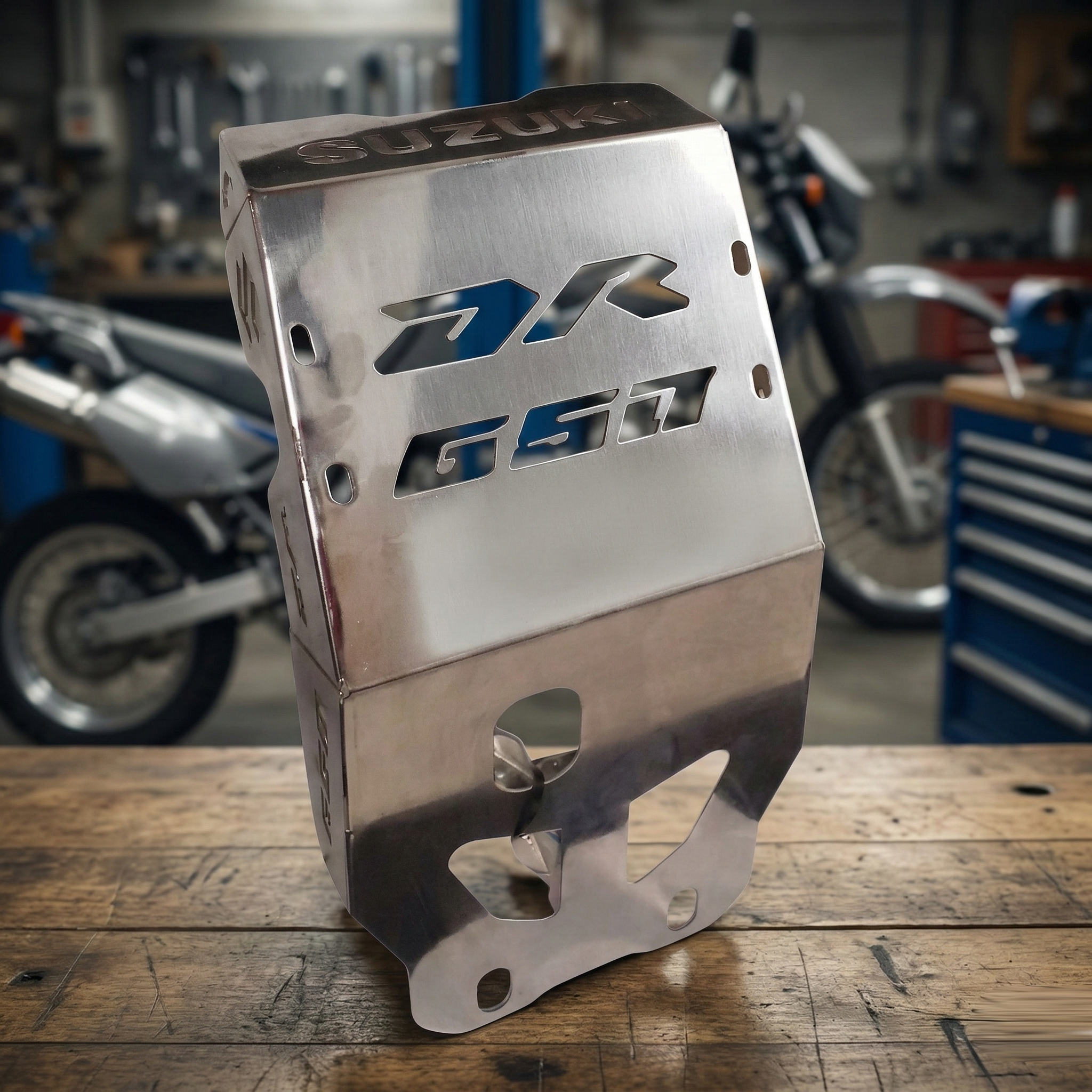 Protector De Motor Suzuki DR 650 en lámina metálica para cubrir cárter y base del motor. Ajuste firme, mejor defensa en ruta y trocha.