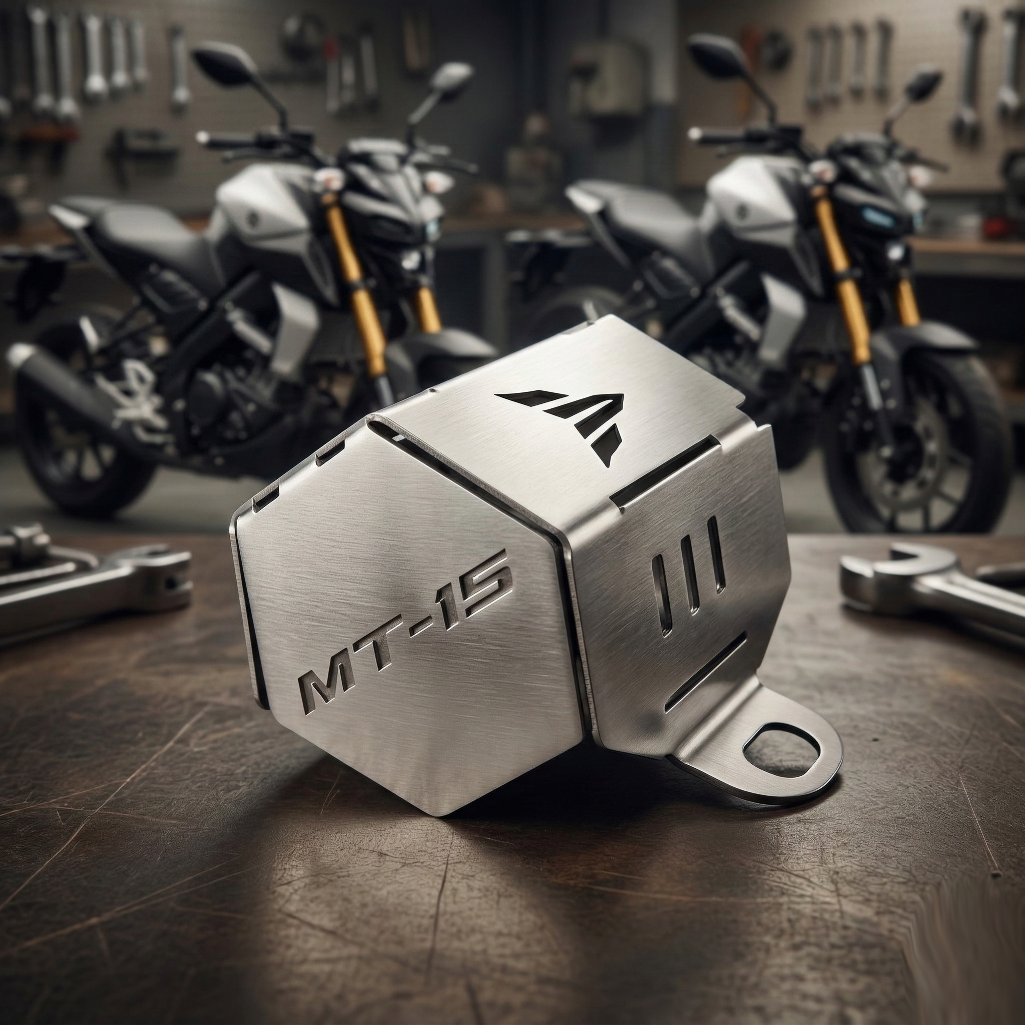 Está fabricado en acero inoxidable. Por lo tanto, ofrece buena resistencia al uso constante. Además, su estructura está orientada a la Yamaha MT 15. Así, mantiene una apariencia acorde con la motocicleta. Su diseño brinda cobertura a una parte expuesta del sistema de freno trasero. De igual manera, aporta una imagen más firme y más cuidada. En varios catálogos aparece como protector de bomba o protector de líquido de freno trasero. Por ende, es una pieza funcional y decorativa.