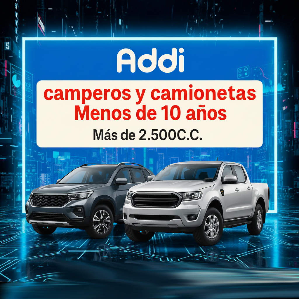 Es la opción a cuotas para SOAT de camperos y camionetas recientes. En concreto, aplica a vehículos con menos de diez años y cilindraje superior a 2.500 c.c. Así, Soat Camperos y Camionetas Menos de 10 Años Más de 2.500 C.C Con Addi ofrece flexibilidad de pago sin tarjeta.