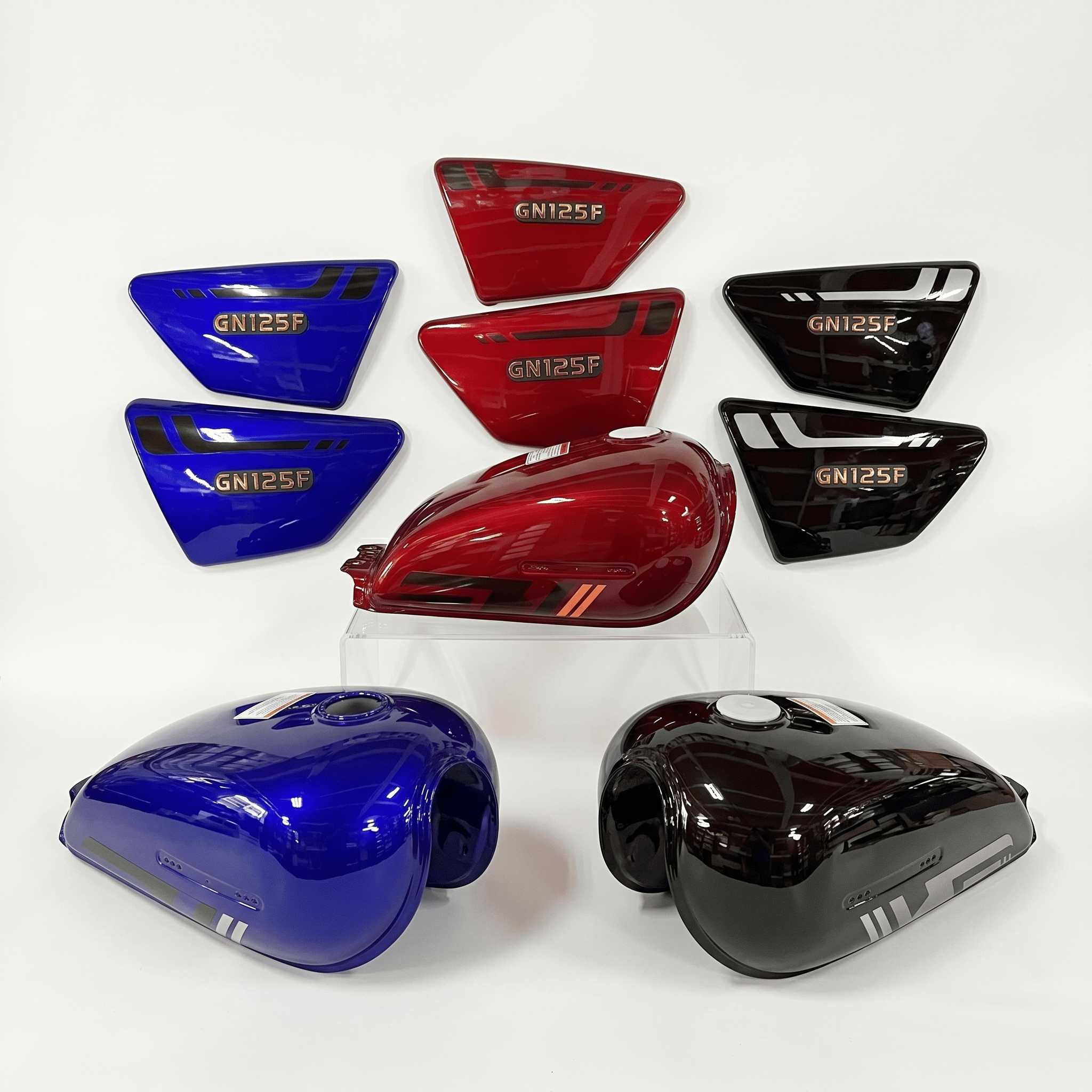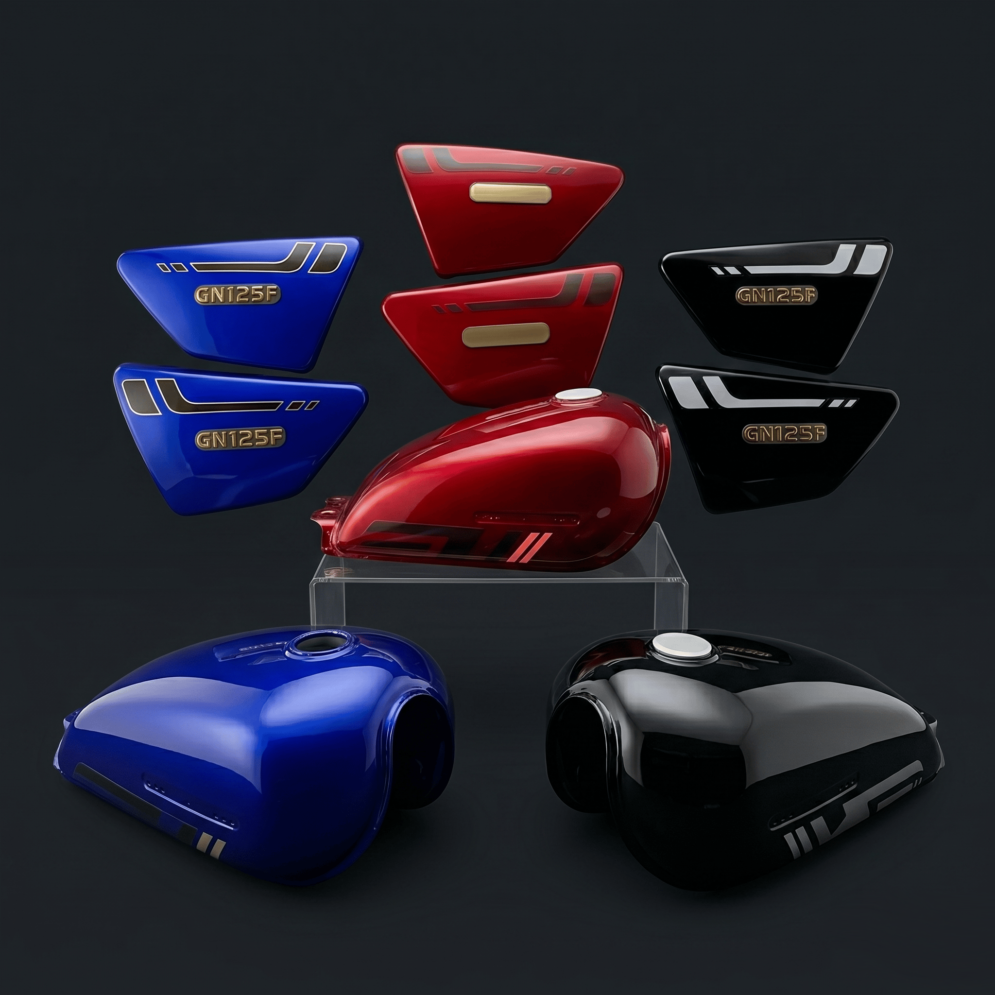 En el mercado esta referencia se publica de forma directa como tanque de gasolina GN125F con tapas laterales. Además, varias publicaciones activas la muestran en colores como rojo, negro, azul y gris. De igual forma, las fuentes consultadas repiten la lógica comercial de vender el conjunto como una sola solución estética para la moto. En consecuencia, es una referencia con base comercial real y con una búsqueda fácil de reconocer.